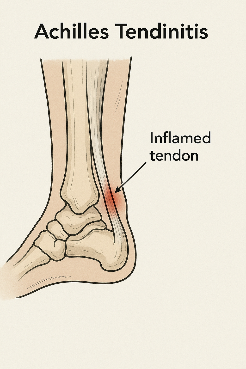 아킬레스건염은 통증이 아킬레스건 중심부 또는 종골 부착부에서 발생합니다. 아침 기상 직후나 장시간 앉은 후 첫 발을 디딜 때 심한 뻣뻣함이 느껴지는 것이 특징입니다.